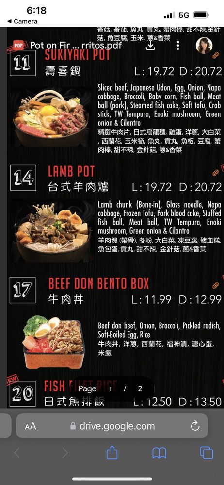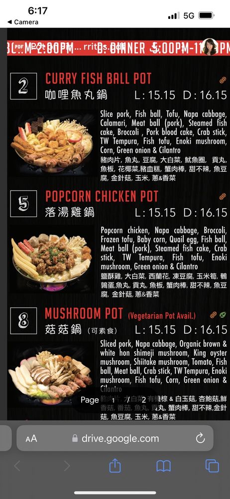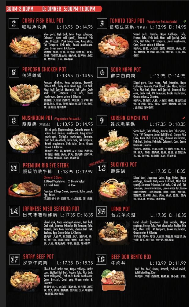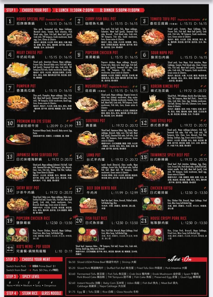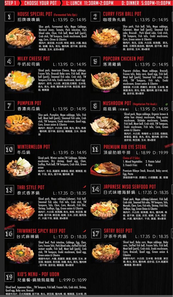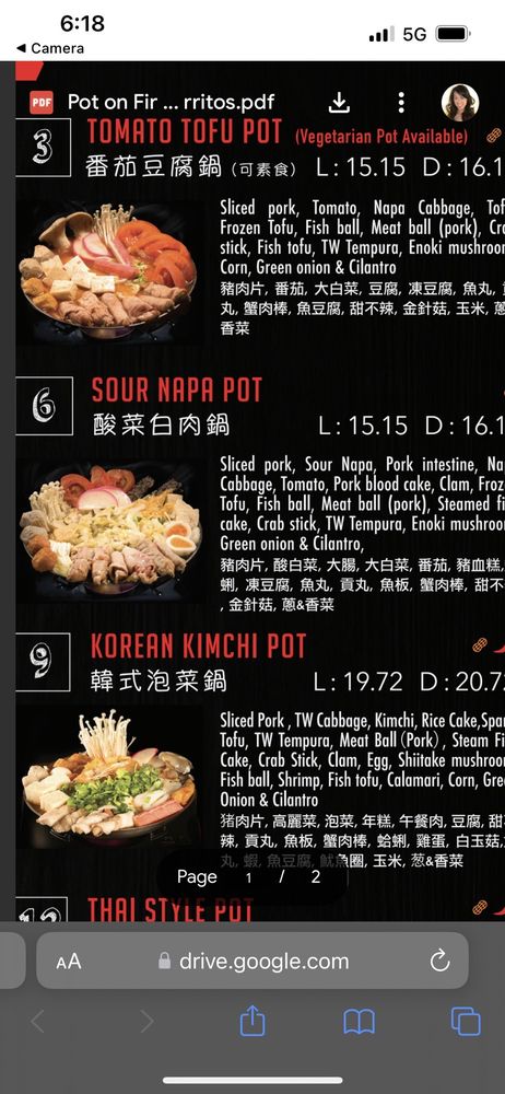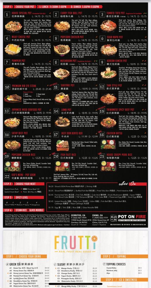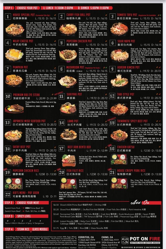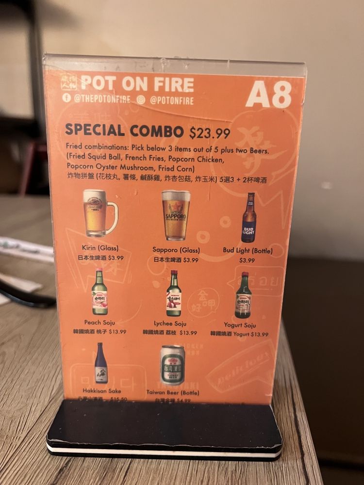 Pot on Fire in Cerritos, CA offers a diverse menu with options for everyone, including vegan choices and allergy considerations. The appetizers range from traditional favorites like Chicken Wings to unique offerings like Fried Pork Blood Rice Cake. Customers rave about the quality of the food, with one mentioning the surprising delight of the Popcorn Bento Box. The atmosphere is described as lively and the service is generally good, although food may take a bit longer during peak times. With a convenient ordering system via QR code and thoughtful touches like an allergy section for orders, Pot on Fire ensures a pleasant dining experience. Don't miss out on their lunch specials and be sure to try the hot pot options that have made this restaurant a hidden gem in Cerritos.
